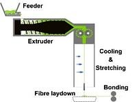 In unserer Arbeit beschäftigen wir uns mit dem mechanischen Verhalten von Polypropylen Spinnvliesen. Bei der Herstellung von Spinnvliesen werden kontinuierlich Filamente mit Durchmessern von wenigen µm ungeordnet abgelegt und anschließend verfestigt. Dies geschieht mithilfe eines Kalanders, zwei beheizten Walzen, von denen eine glatt ist und eine ein strukturiertes Muster aufweist, so dass die Fasern punktuell verschweißt und damit thermisch verfestigt werden. Dadurch bildet sich ein weiches, luft- und flüssigkeitsdurchlässiges aber widerstandsfähiges Material aus.