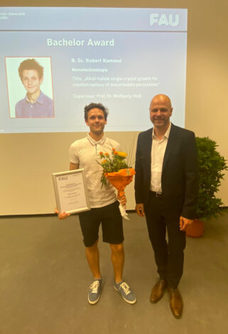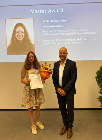 Finally, Prof. Spiecker presented the departmental awards. The prize for the best bachelor’s degree went to former Semikron award winner and NT student Robert Kammel. Maret Ickler from the NT program and Johannes Seltsam and Timo Bergerfrom the MWT program each received a Master’s degree award. Dr. Sarah Trockel and Dr. Marcus Himmler were awarded for the best doctorates.